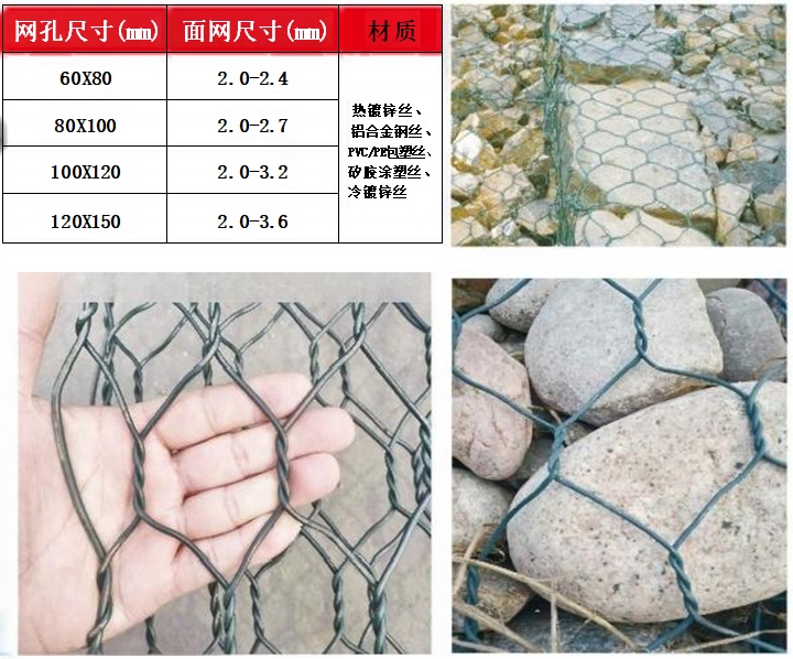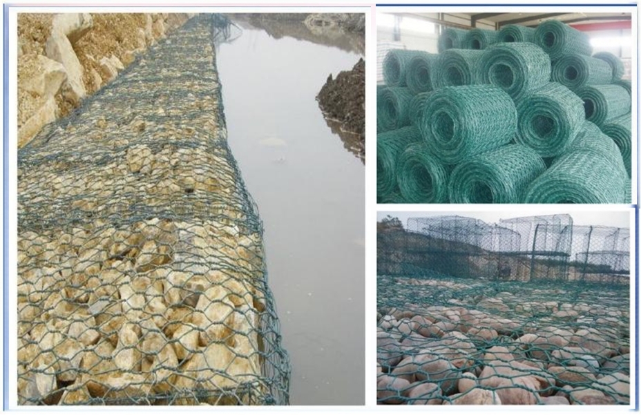 覆塑石笼网分表面金属镀层和表 面 PVC/PE 涂层两个大类。使用的金属线径是根据石笼网的大小而 不同。生产过程是经织网,剪切,锁边,绑扎后制成石笼网箱和石笼护垫,主要用作河道、岸坡、路基边坡护坡结构。既可防止 河岸遭水流、风浪侵袭而破坏又实现了水体与坡下土体间的自然对流交换功能,达到生态平衡 。坡上植绿可增添景观、绿化效果。